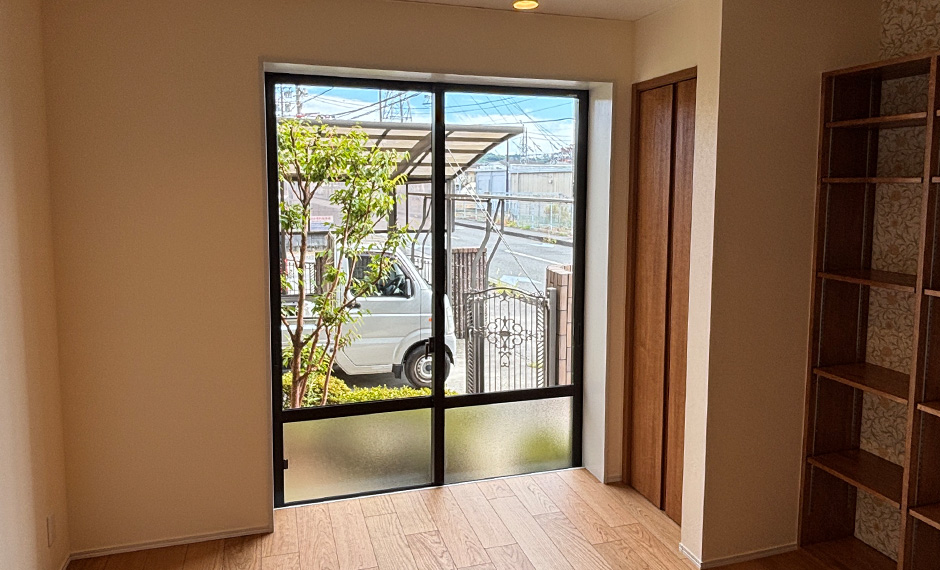 掃き出し窓にインプラスを2枚追加し、計3重サッシに。明るさを確保したいとのご要望に合わせて、乳白のガラスを採用しました。