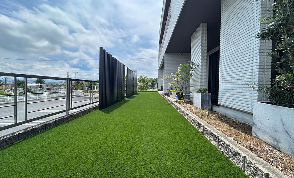 - 以前は天然芝のお庭でしたが、お手入れの負担を軽減するため人工芝に変更しました。さらに、南側の住宅が取り壊され高台の立地ゆえに視線が気になるとのことで、おしゃれな目隠しフェンスも設置。アルミ製の角柱をバランス良く並べ、すっきりとした印象に仕上げています。