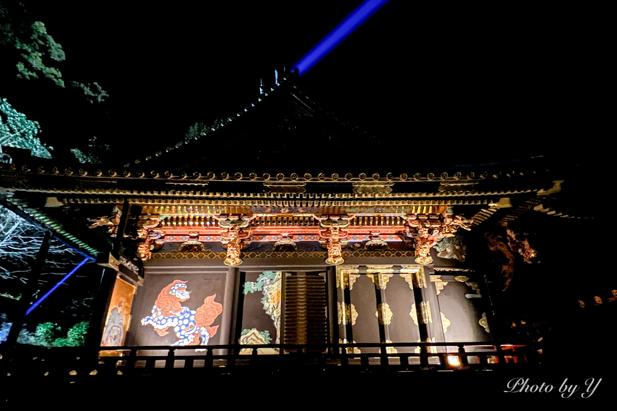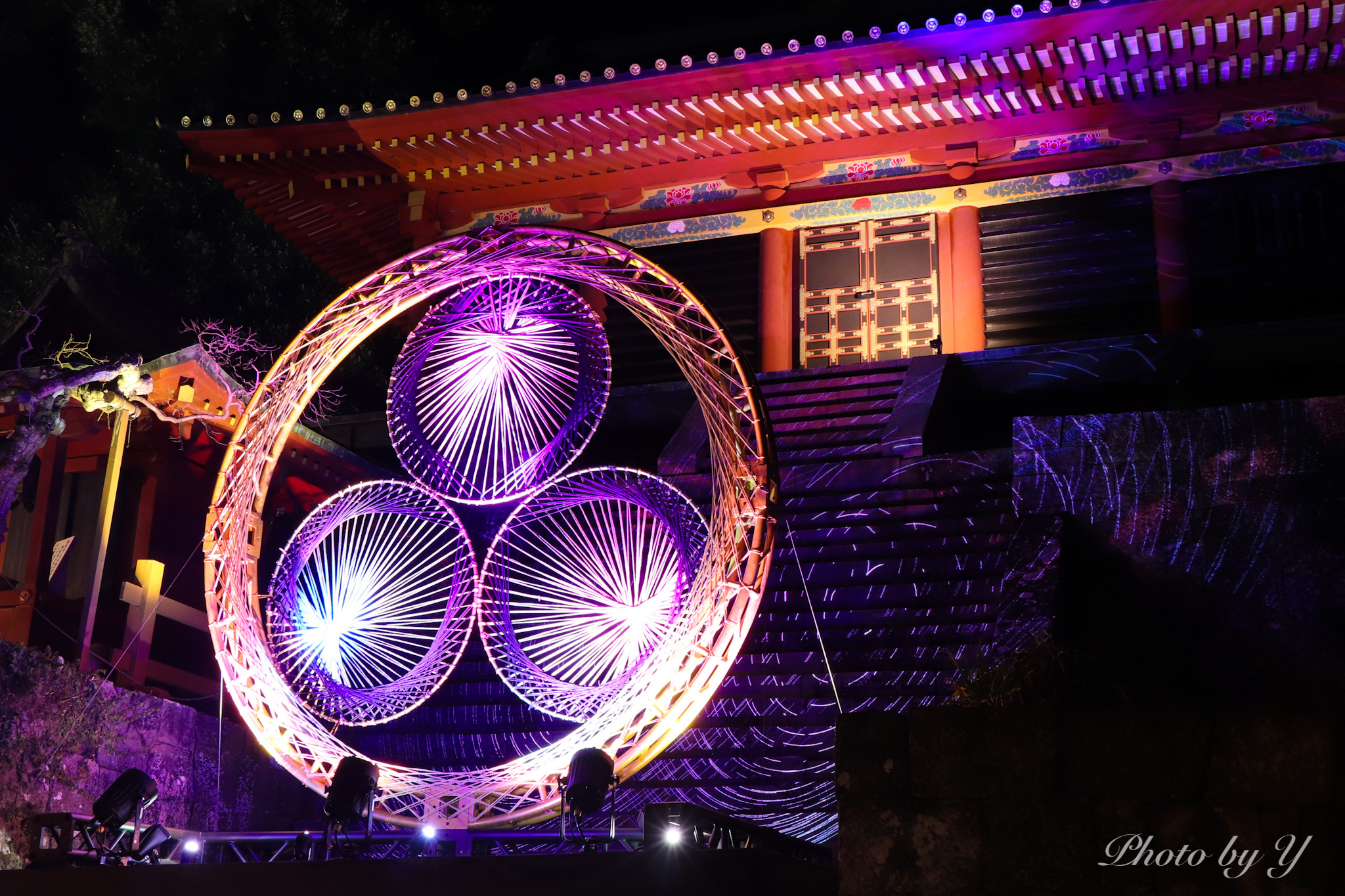 ライトアップは全体的には青系や紫系で、私の好きな色合い。写真には写りませんが、小さな光が木々に舞っていて、まるで小さな蛍が集まっているかのようでした。一番奥にある家康公のお墓にお参りして下山。一番印象的だったのは、冒頭の写真にもある通り、葵のご紋のライトアップでした。色々な色にかわるがわる照らされて、その大きさと色の変化は圧巻でした。